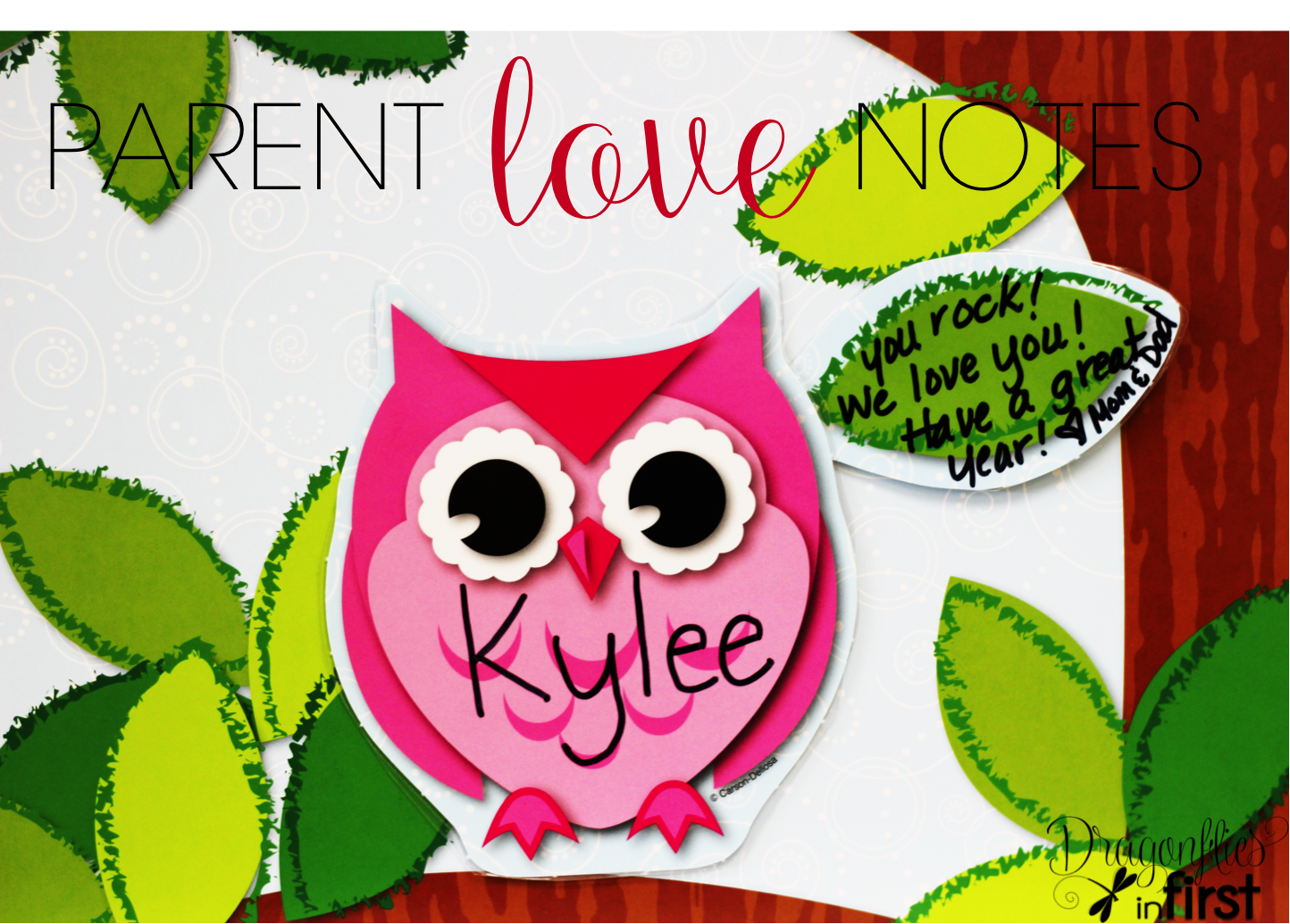 Once class lists are distributed, each child’s name will be written on an owl. During our “Back-to-School” – parent information – night, each parent will receive a little laminated coordinated leaf. On that leaf the parents will use sharpie to write a little note to their kiddo and then stick it next to their child’s owl.
