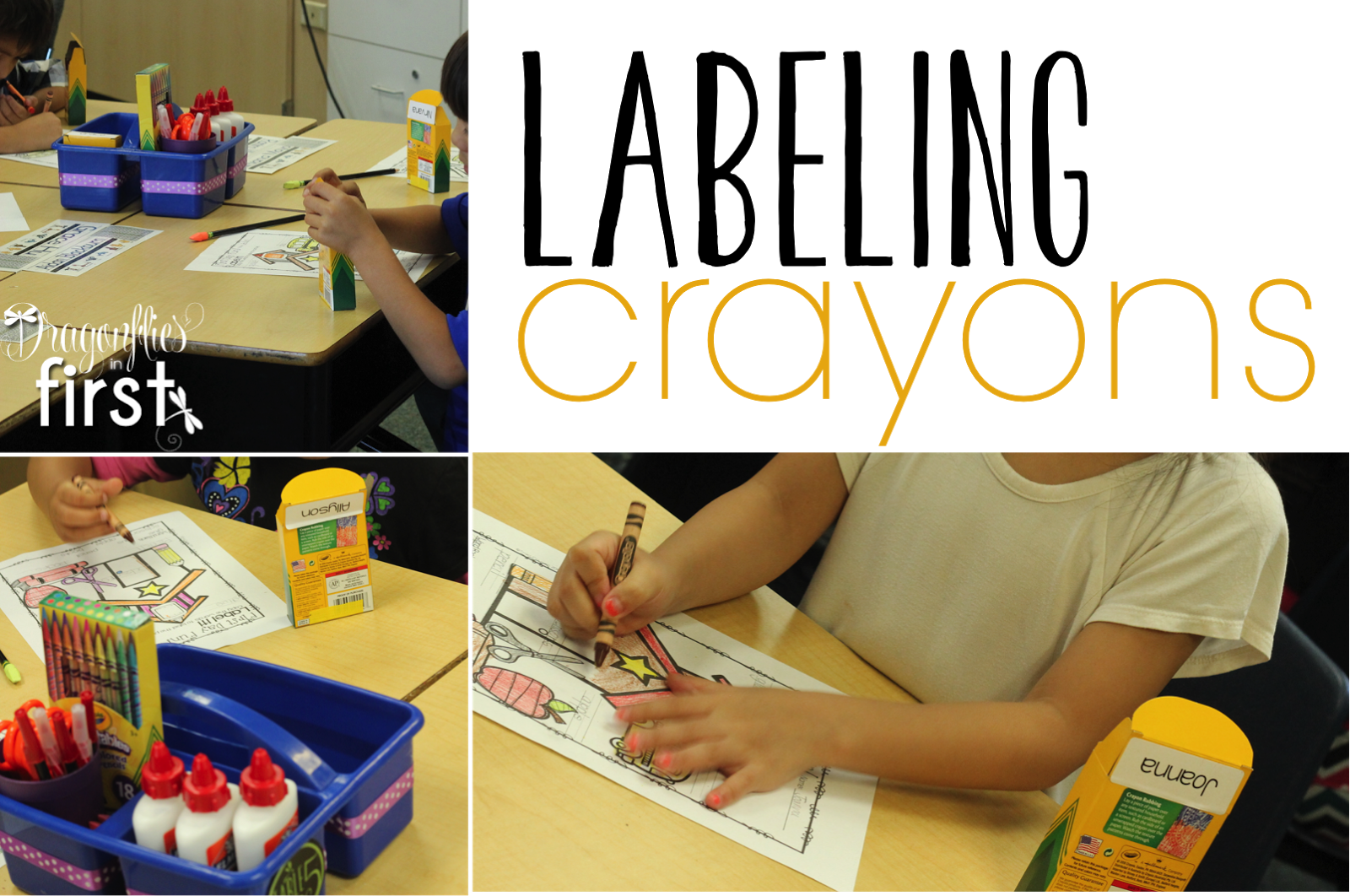 The crayons belong to each individual student – so I label them after getting my class list. (The caddie photo above was taken before school started this summer.)